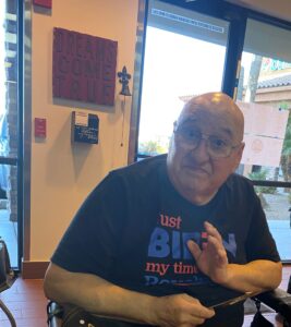He charged full speed ahead in everything he did. He was the tallest man I have ever known in a wheelchair, bigger than life. He loved to watch TV on his big screen; politics, CNN, it’s so ironic he is being buried on election day. He was a member of AA for 19 years. By the Grace of God he died sober. He loved to take his little Yorkie for strolls and talk with all the neighbors. He never met a stranger. He was so easy to love. He will be dearly missed.